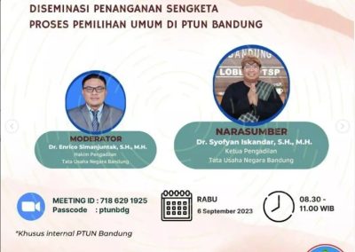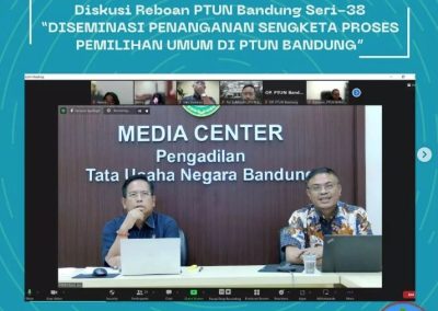 Diisi dengan materi diseminasi penanganan sengketa proses pemilihan umum di PTUN Bandung, dimana Pengadilan Tata Usaha Negara mengambil peran dalam proses penyelenggaraan pesta demokrasi serentak pada tahun 2024 mendatang. Kewenangan PTUN dalam menerima, memeriksa, memutus dan menyelesaikan Sengketa Proses Pemilihan Umum setelah seluruh upaya administratif di Bawaslu dilalui oleh Penggugat didasarkan pada UU No 7 Tahun 2017 tentang Pemilu.
