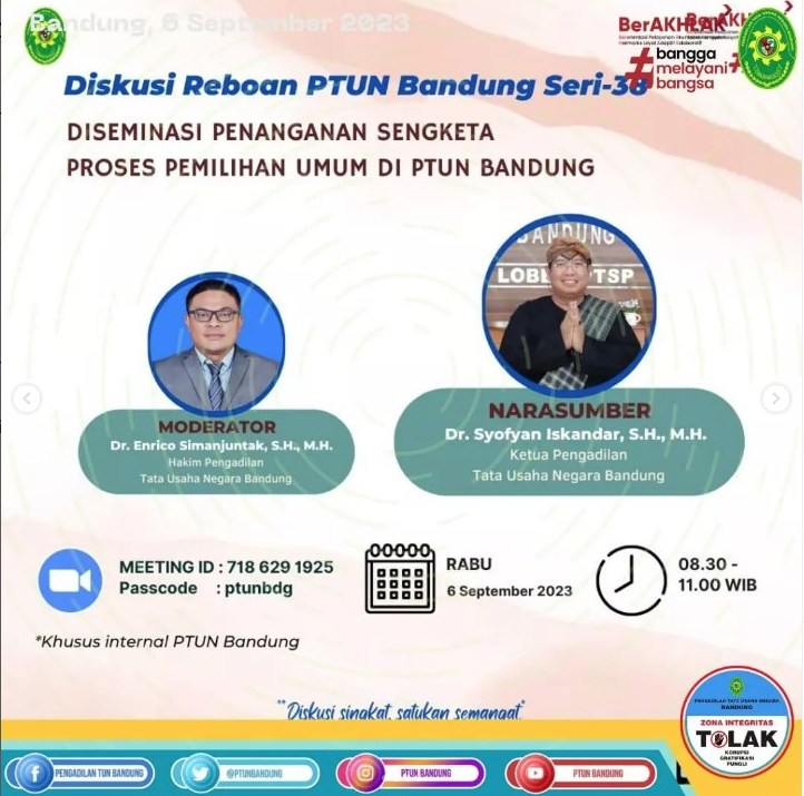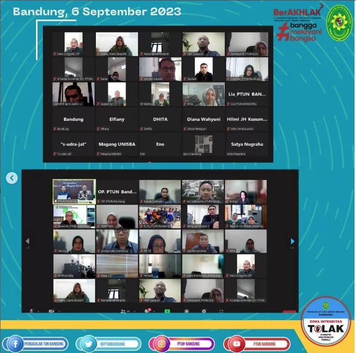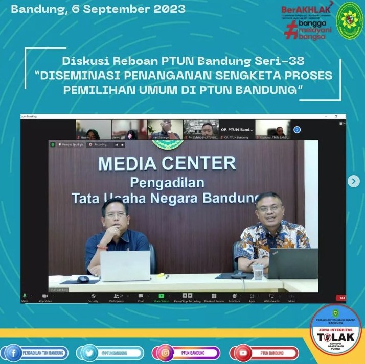 Melalui zoom meeting, diskusi reboan seri-38 kali ini khusus diikuti oleh internal PTUN Bandung yaitu Hakim, Kepaniteraan, Kesekretariatan dan Petugas PTSP.