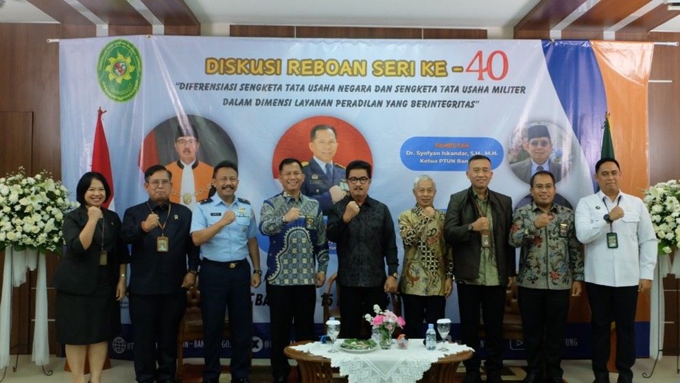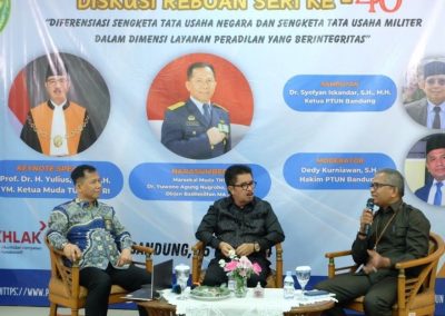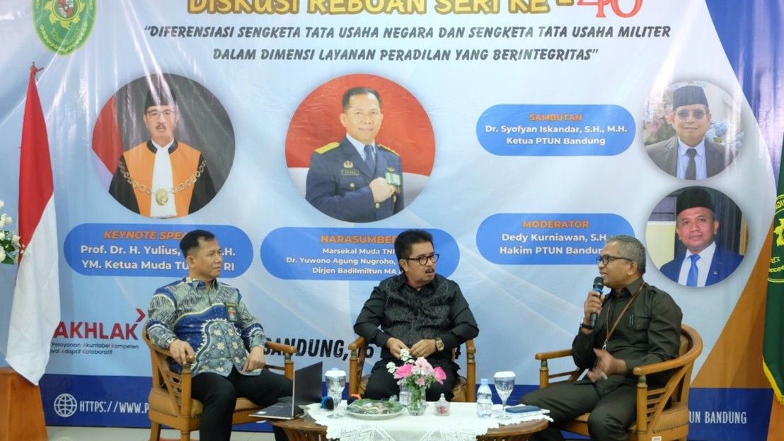 Pengadilan Tata Usaha Negara Bandung kembali menyelenggarakan Diskusi Reboan Seri ke-40 Edisi 2 Tahun 2024 dengan tema “Diferensiasi Sengketa Tata Usaha Negara dan Militer dalam Dimensi Layanan Peradilan yang Berintegritas.” Diskusi yang berlangsung pada hari Rabu ini dibuka dengan keynote speech dari YM Prof. Dr. H. Yulius, S.H., M.H., Ketua Muda Tata Usaha Negara MA RI. Acara ini juga menghadirkan Direktur Jenderal Badan Peradilan Militer dan Peradilan Tata Usaha Negara, Marsekal Muda TNI Dr. Yuwono Agung Nugroho, S.H., M.H., sebagai narasumber utama.