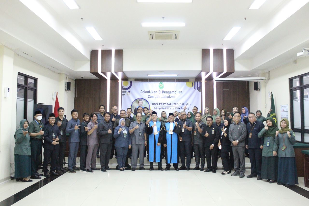 Pengadilan Tata Usaha Negara (PTUN) Bandung menggelar Pengambilan Sumpah Jabatan dan Pelantikan Wakil Ketua PTUN Bandung, Bapak Roni Erry Saputro, S.H., M.H. Acara berlangsung khidmat di Ruang Sidang Kartika PTUN Bandung dan dipimpin langsung oleh Ketua PTUN Bandung, Bapak Dr. Agus Budi Susilo, S.H., M.H.