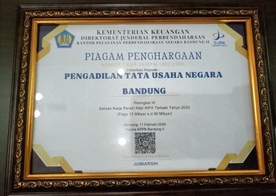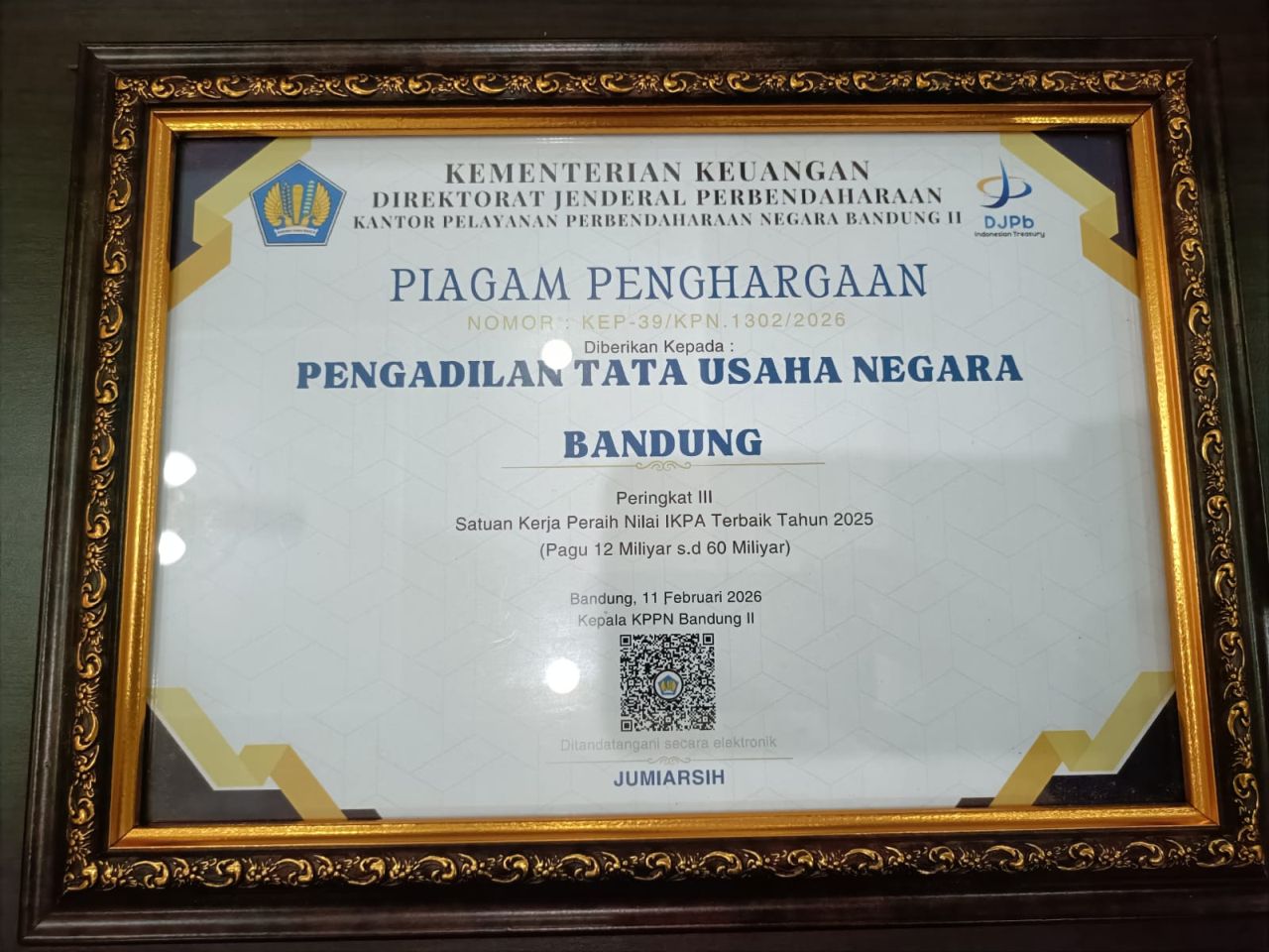 Pengadilan Tata Usaha Negara Bandung berhasil meraih Peringkat III Kategori Satuan Kerja Peraih Nilai IKPA Terbaik Tahun 2025 dalam kegiatan KPPN Bandung II Award Tahun 2025 yang diselenggarakan oleh KPPN Bandung II.
